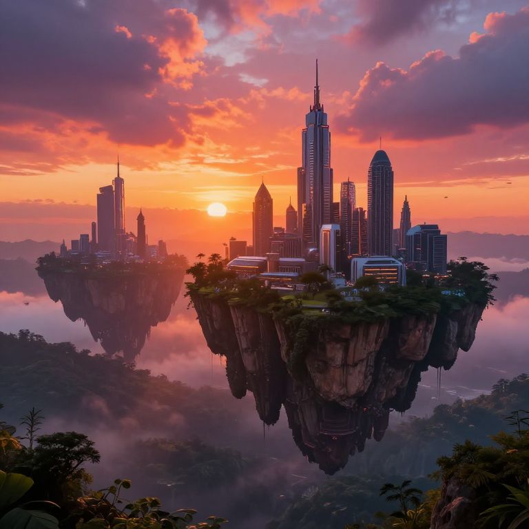 Digital art of a futuristic cityscape at sunset, floating on a cliff surrounded by misty valleys, with vibrant orange and purple clouds.