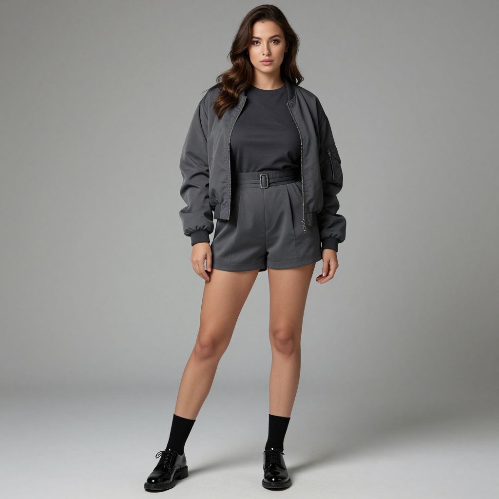 "Woman, casual contemporary, gray bomber jacket, dark gray t-shirt, matching belted high-waist shorts, black ankle socks, glossy black Oxford shoes, photo studio background. Sexy. Pretty face and beаutiful eyes. Big breasts."