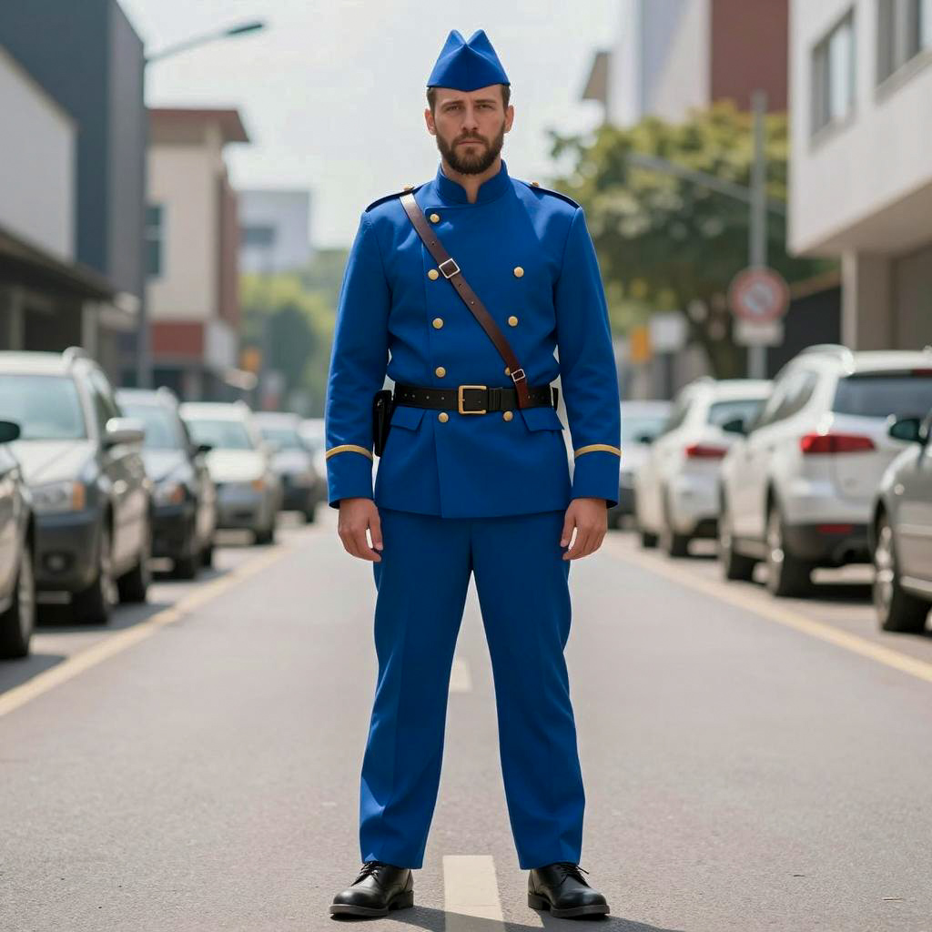 Blue sgt pepper costume, photograph of a man standing on a bright, sunny street, wearing a blue uniform with gold buttons, black belt, brown leather straps, black shoes, blue cap, medium build, beard, light skin, blurred background with parked cars, daytime, realistic style, full-body shot, straight-on, clear sky, modern urban setting