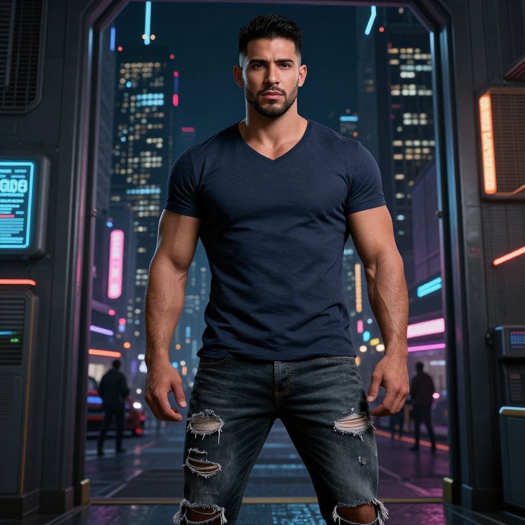 Photograph of a muscular, bearded man in a black V-neck shirt and ripped jeans standing in a neon-lit, futuristic city street at night