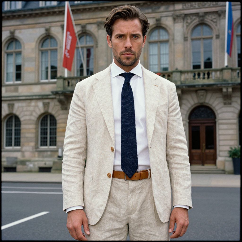 A man, light beige linen suit, white button-up shirt, navy knitted tie, tan suede derby shoes, matching tan leather belt, historic stone building, arched windows, flagpole with banners, lithographic film style, confident expression. Man has masculine face and piercing eyes