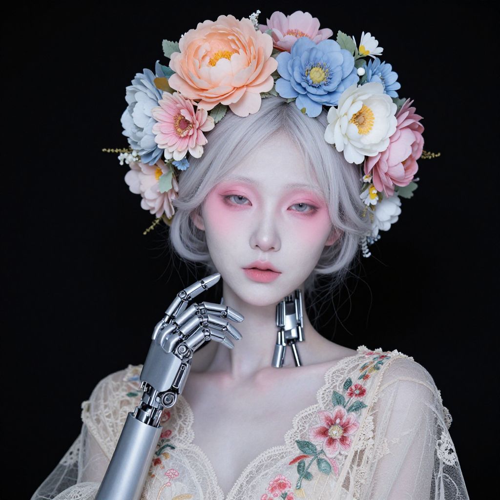 Digital portrait of a pale, androgynous figure with silver hair, wearing a floral crown and lace dress, featuring a robotic hand, against a