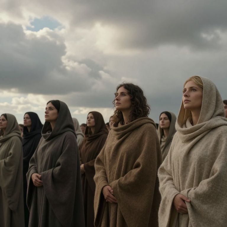 A gathering of souls draped in ancient cloaks stands in reverent silence, their eyes lifted toward a sky of billowing clouds that seem to whisper timeless truths, evoking a profound sense of awe and collective contemplation.