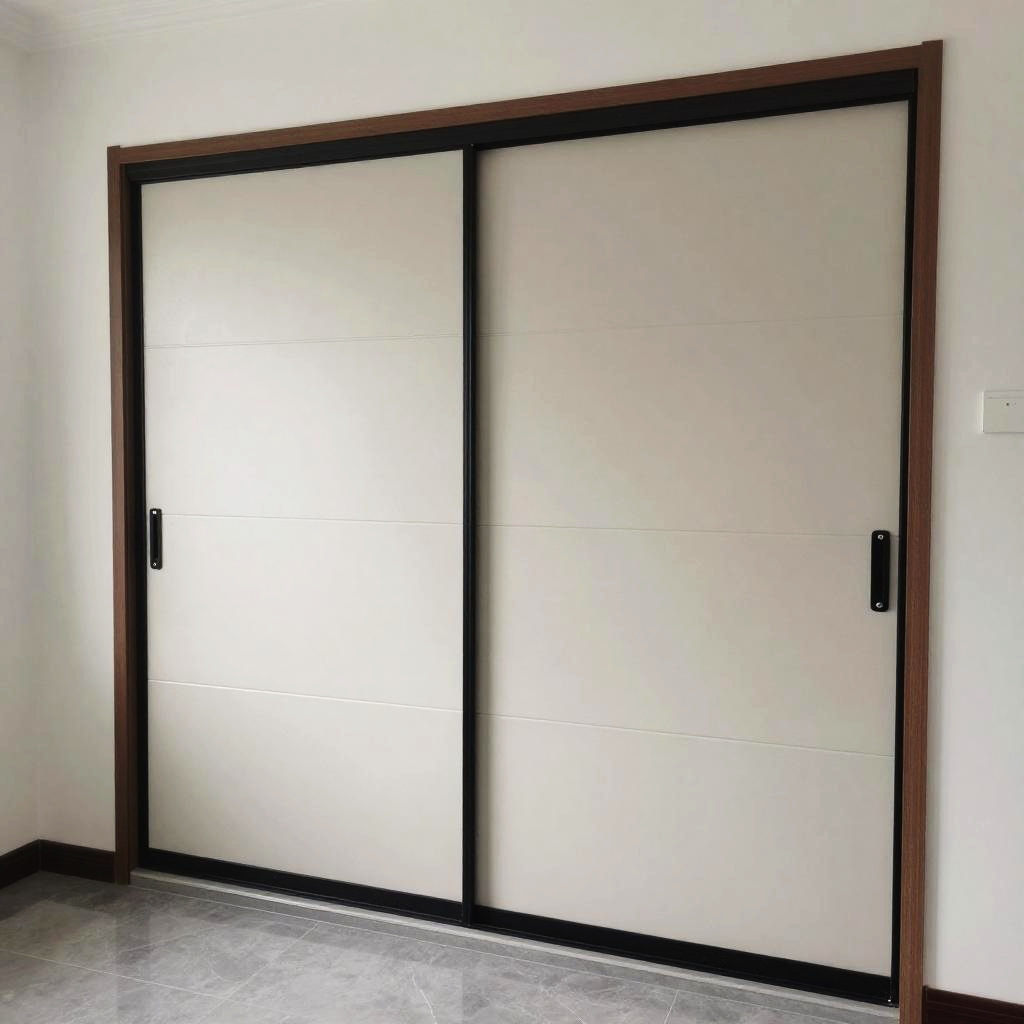 Minimalist indoor space featuring large sliding doors with a white finish and black frames. The doors are set within a wooden door frame, complementing the clean tiled flooring and plain walls, creating a sleek and contemporary interior.