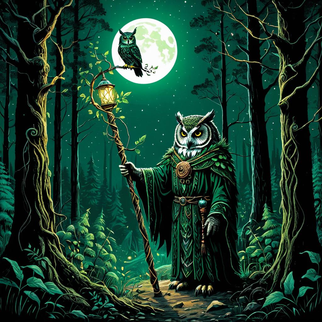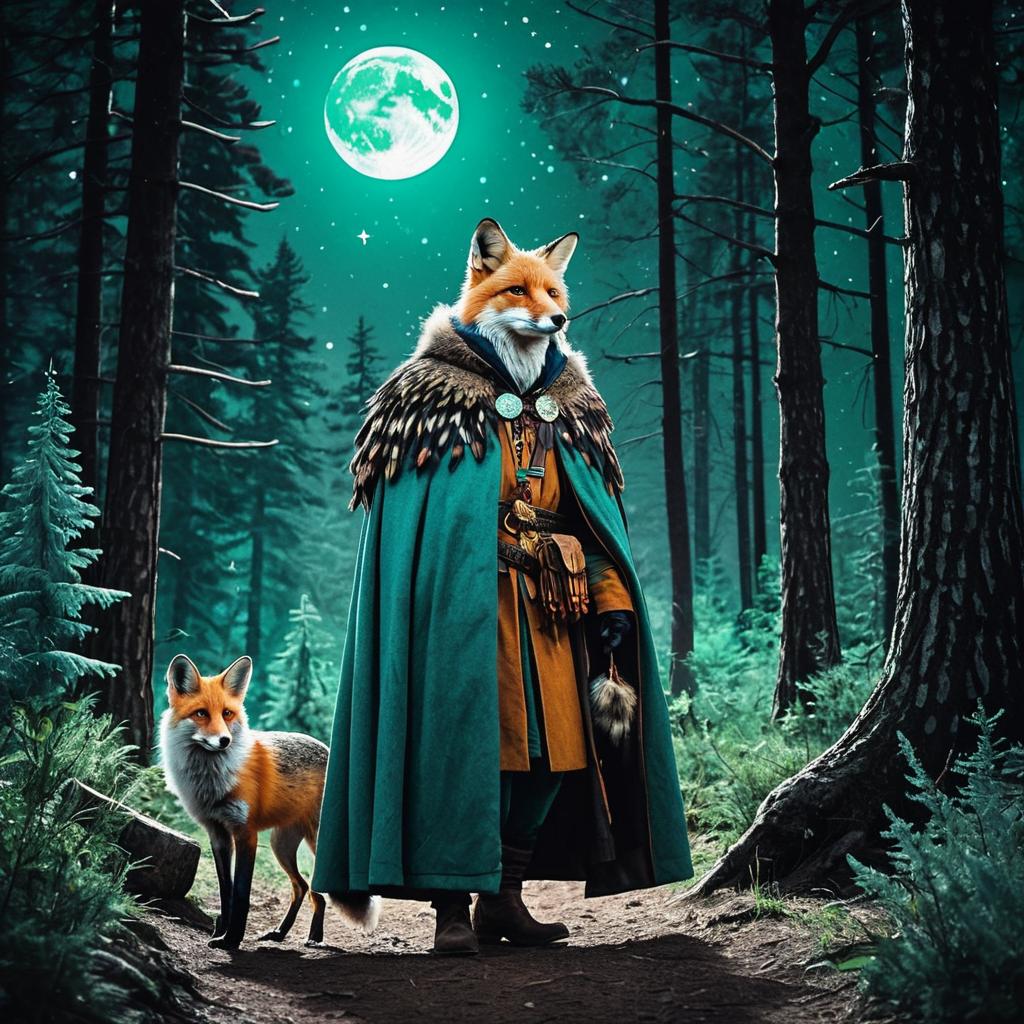 A fantastical scene featuring an anthropomorphic fox dressed as a traveler wearing a feathered cloak and medieval-style clothing, walking through a dense forest at night. The setting includes tall trees and a bright mint green full moon illuminating the mystical atmosphere. A real fox with a small green cloak stands beside the traveler on a forest path.