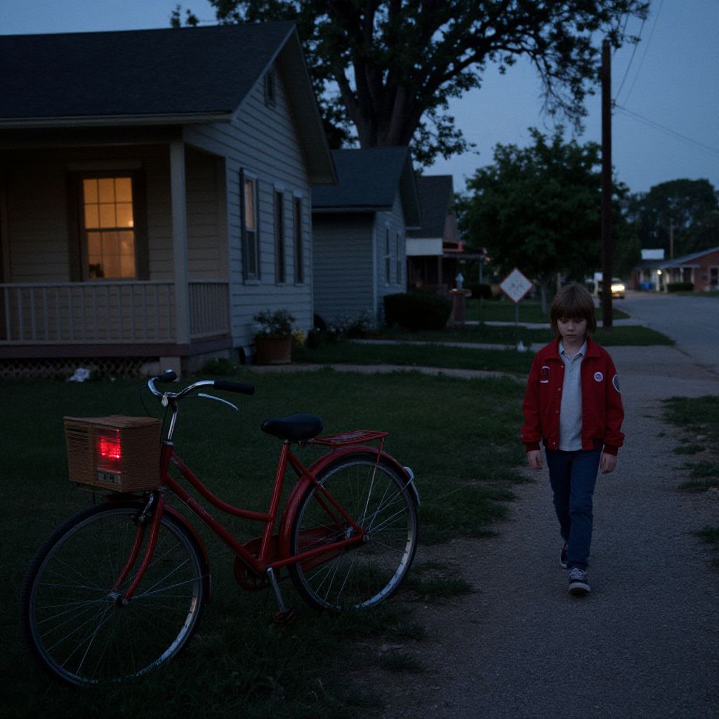 Stranger Things prompt: A quiet town during a summer evening, with a red bicycle parked in front of a house, a mysterious radio playing distorted music, and a child with a strange red jacket walking down the path, eerie and nostalgic, 4K, 1980s film tone.