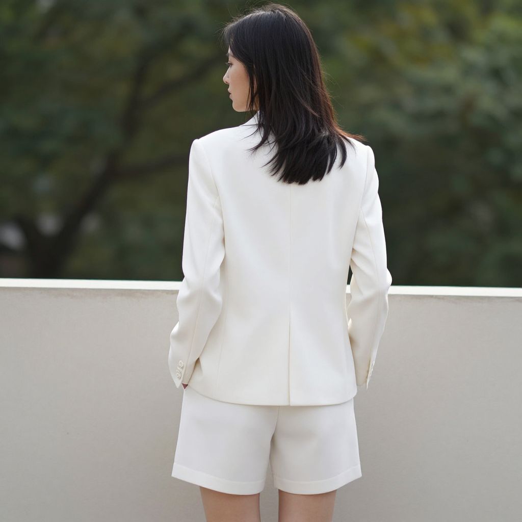 Photograph of a woman standing outdoors with her back to the camera. She has dark, shoulder-length hair and is wearing a crisp white blazer and matching white shorts. The background shows blurred greenery, indicating a garden or park setting. She's leaning against a light-colored wall, with natural light highlighting her outfit. Her posture is relaxed, with hands in her pockets.