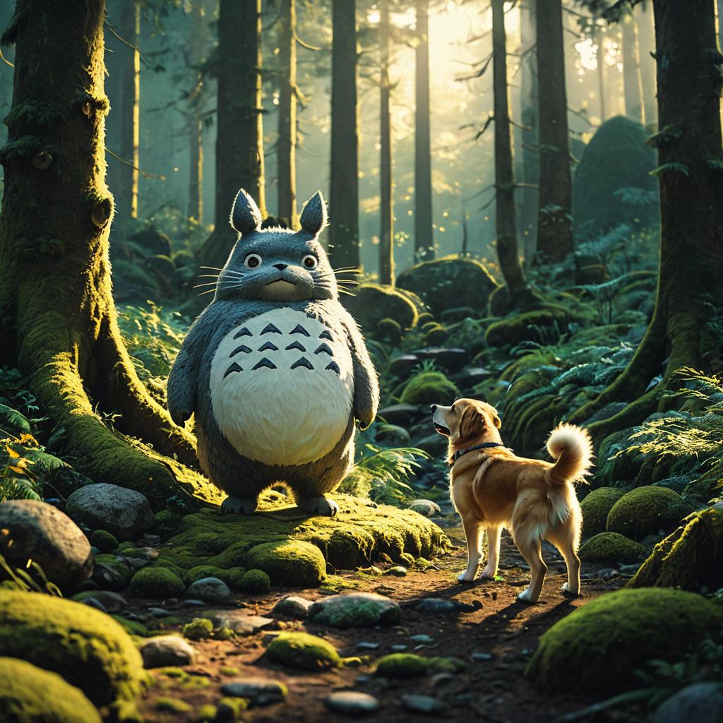 A photorealistic digital painting of a full-body character fusing a dragon and a cybernetic owl standing in an ancient, mystical forest at dawn. The scene features volumetric lighting, Kodak film grain effects, and a shallow depth of field. A lone figure in a cloak faces the mechanical creature amidst tall trees and lush undergrowth, emphasizing a fantasy and surrealism aesthetic inspired by Studio Ghibli.