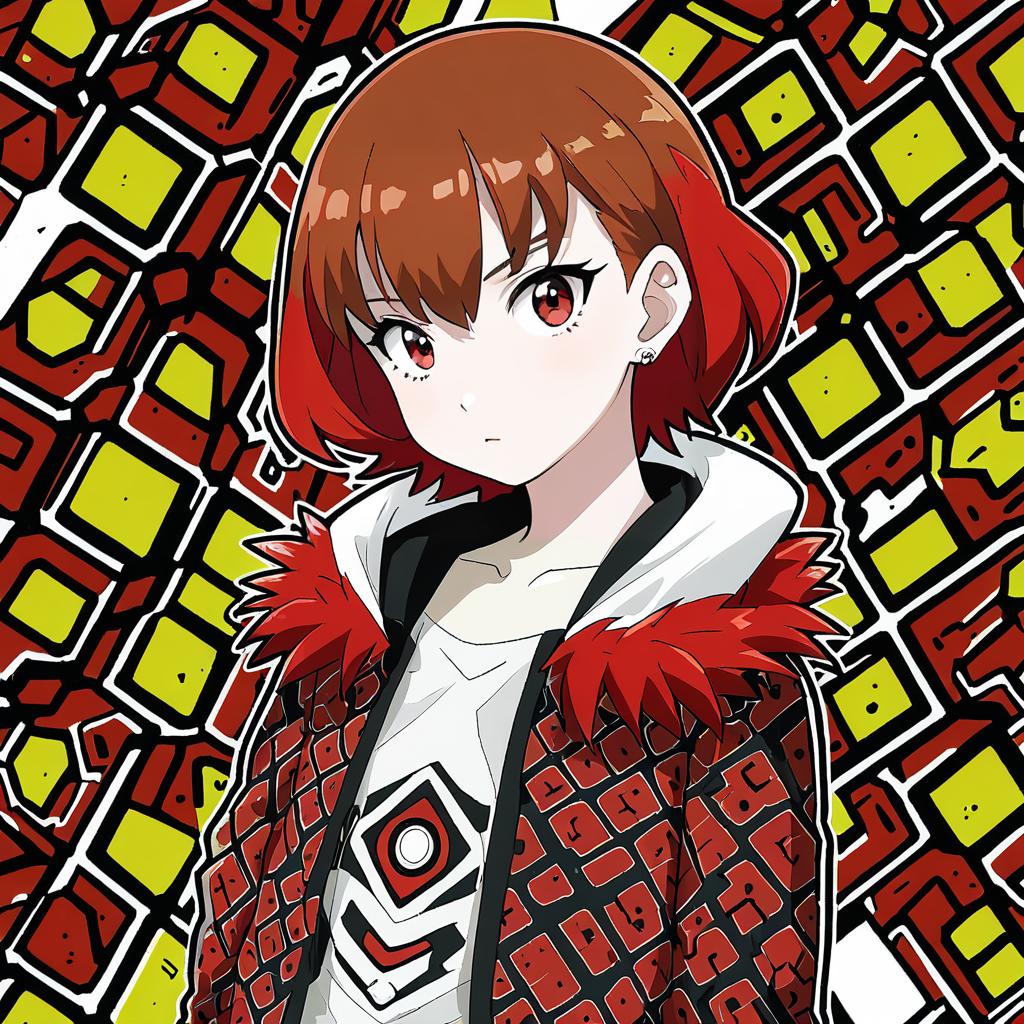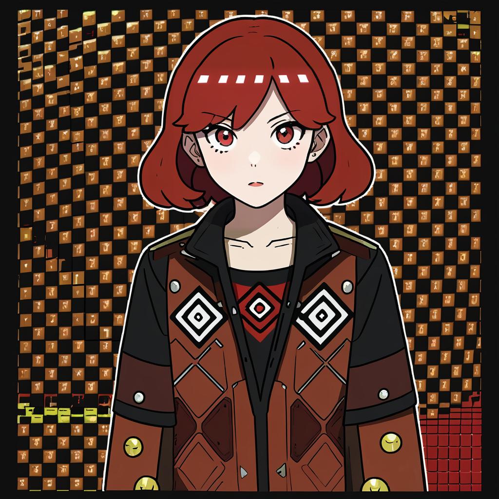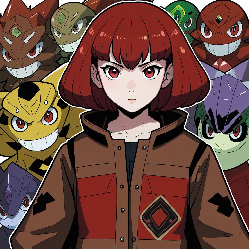 Arezu (pokemon), pokemon, 1girl, red eyes, short hair, red hair, brown hair, collarbone, diamond clan outfit, jacket, long sleeves, cowlick, by artist cofffee, anime