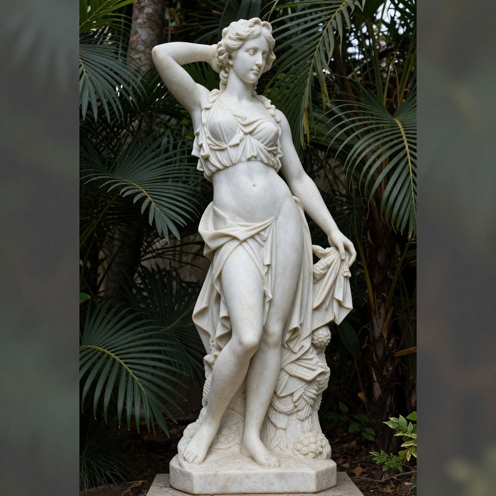 Photograph of a white marble statue of a pregnant, Greco-Roman style goddess with flowing drapery, raised arm, and lush palm trees