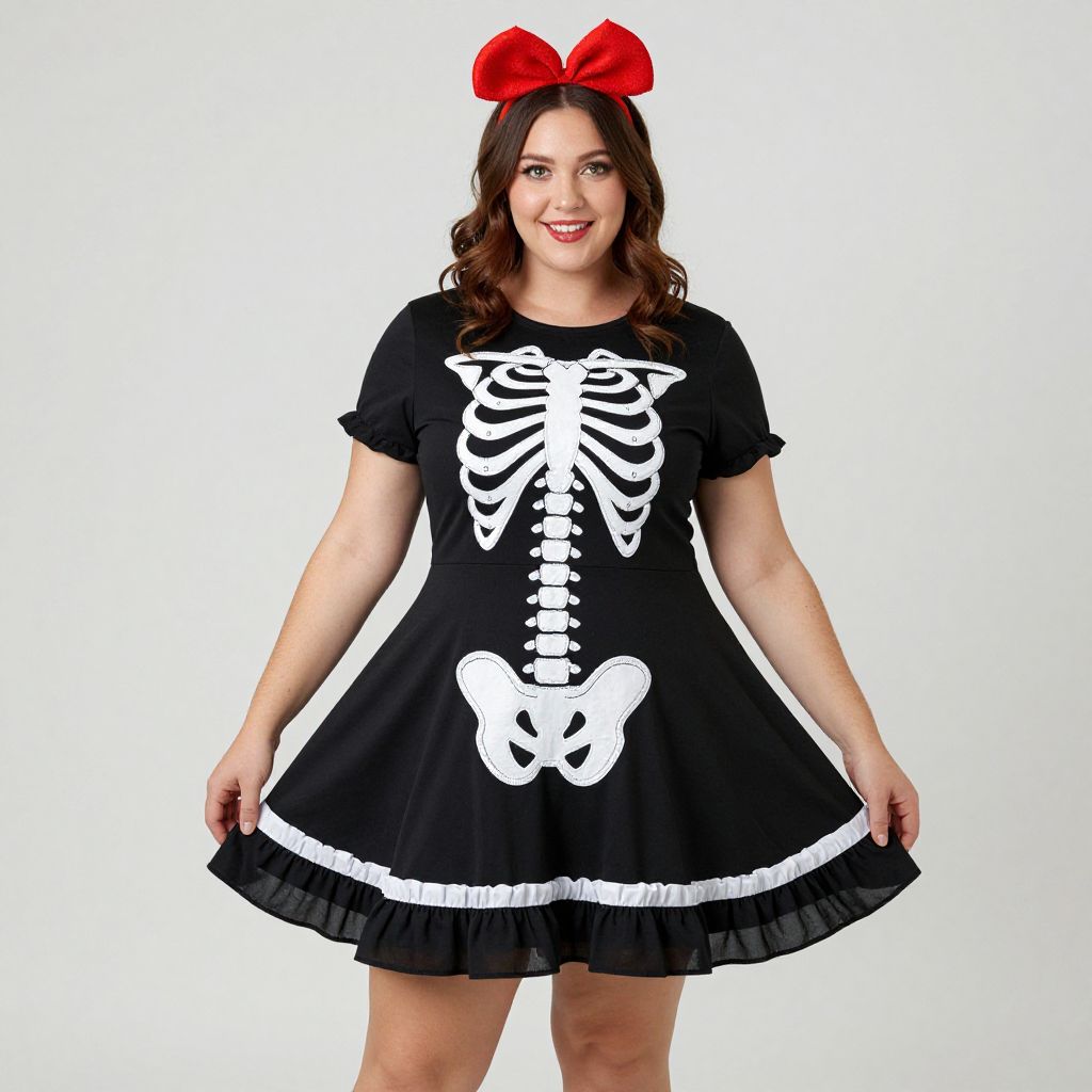 Woman modeling a plus-size Halloween costume featuring a black dress with a detailed white skeletal design, complemented by a red bow headband and matching ruffled hem.