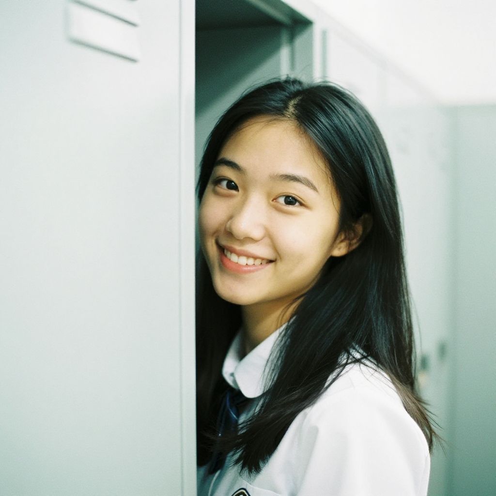 1girl, idol, depth of field, photo, film, upper body, face, skinny, smile, teeth, school, locker
