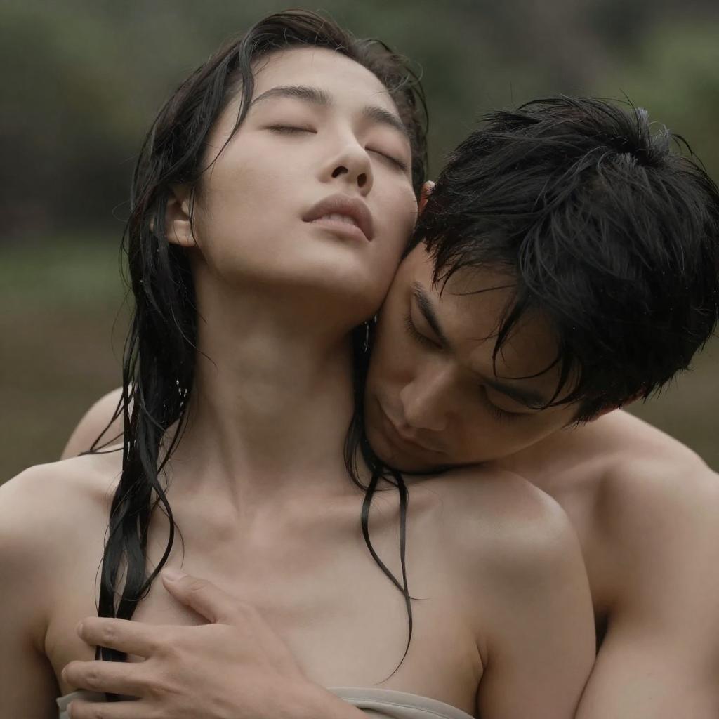 Photograph of a shirtless man and woman lying in bed. Woman with dark hair, closed eyes, arms around man's chest. Man with dark hair, neutral expression, chest hair visible. Pillows with striped and solid patterns in background. Soft lighting. Woman on left, man on right. Intimate, close embrace.
