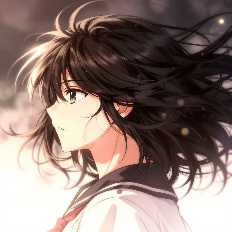 Dynamic scene focusing on manhwa hair blowing in the wind, exaggerated strands and volume with detailed shading and highlights, capturing motion and emotion in a dramatic, ethereal background filled with glowing particles.
