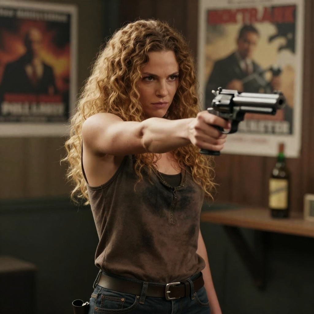 Red-haired Woman Aiming Handgun Indoors