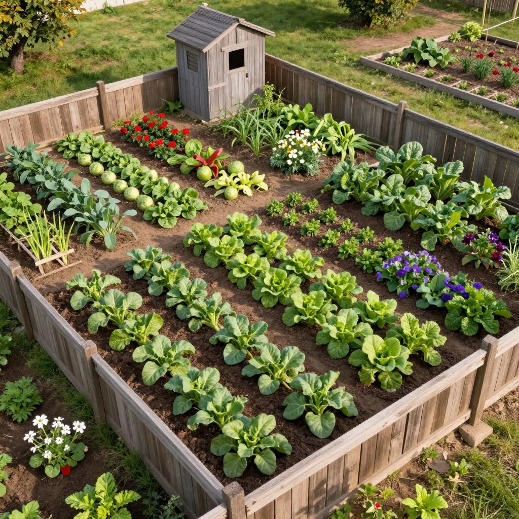 100 square meters land urban garden plot, neat rows of vegetables and flowers, wooden fencing, small tool shed, morning light, detailed textures, photorealistic rendering