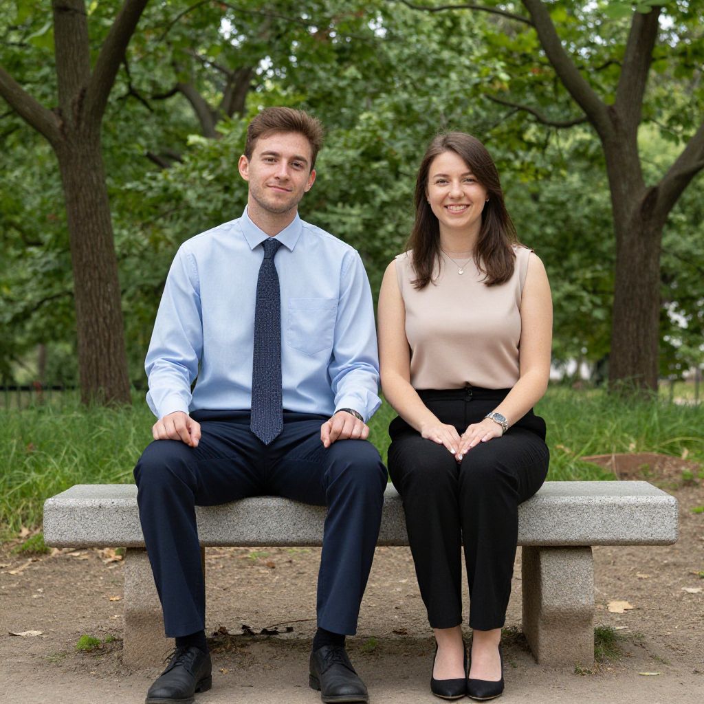 Two individuals sit side by side on a stone bench in a park, surrounded by lush green trees, with the man wearing a light blue shirt and dark tie, and the woman dressed in a sleeveless beige top and black pants, both smiling warmly towards the camera.