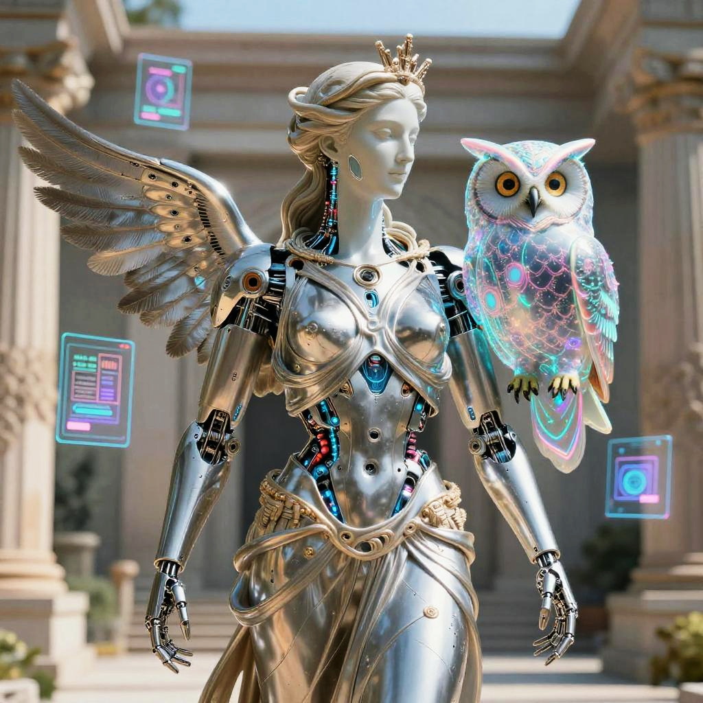 Athena AI Art showing a robotic Athena with sleek metallic feathers and a holographic owl companion, standing in a virtual temple with floating holograms, blend of classical sculpture and advanced AI technology, vibrant electric colors