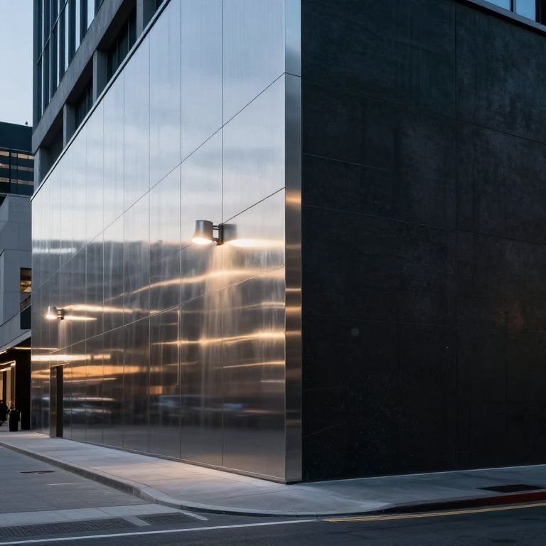 A futuristic urban street scene at dusk where a reflective stainless steel wall glimmers under streetlights, opposite side is a matte black concrete wall with no reflections, the light and shadow contrast creates a striking visual effect, realistic cityscape, detailed textures, photorealistic