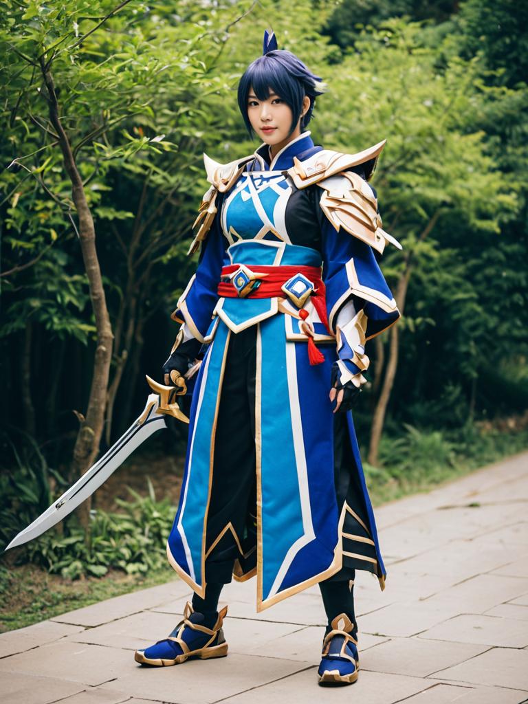 Photo-realistic full body shot of a cosplayer dressed in a detailed Ajaw costume from the video game Genshin Impact. The outfit features blue, gold, and red colors with elaborate armor pieces on the shoulders and forearms, paired with a matching sword. The person has short dark blue hair styled to match the character and stands on a paved path with a natural green forest background.