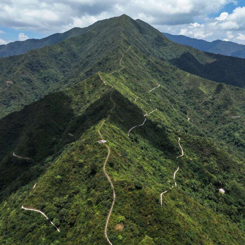 Aerial view of green mountain greenery blanketing vast valleys and ridges, winding trails cutting through dense vegetation, dynamic cloud shadows playing on the surface, rich textures