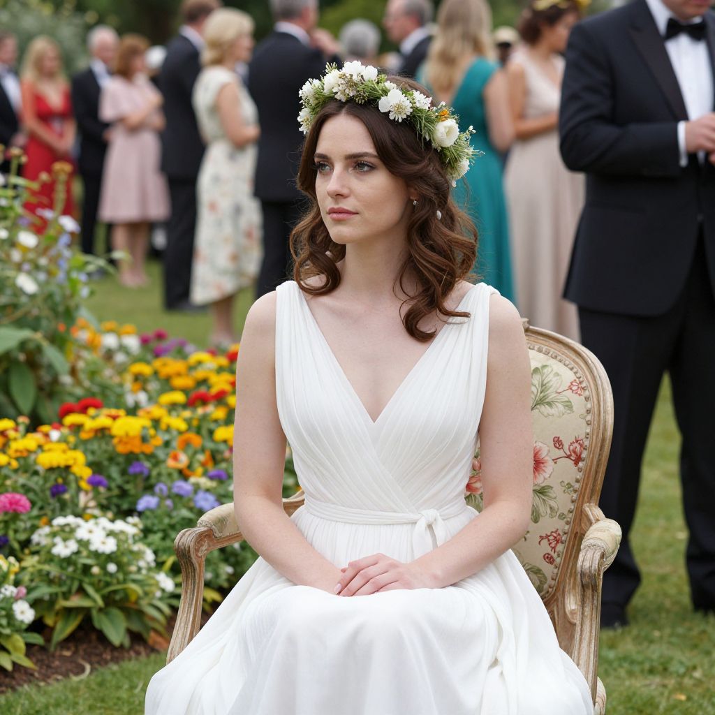 Photograph of a fair-skinned woman with dark, wavy hair, wearing a white, sleeveless, V-neck wedding dress and a flower crown, sitting on an ornate, floral-patterned chair in a garden. She has a contemplative expression. Behind her, a diverse group of people in formal attire, including men in black tuxedos and women in dresses, are gathered. The background features a vibrant garden bed with colorful flowers like yellow, red, and purple blooms. The image has a soft, natural light, enhancing the serene and elegant atmosphere.