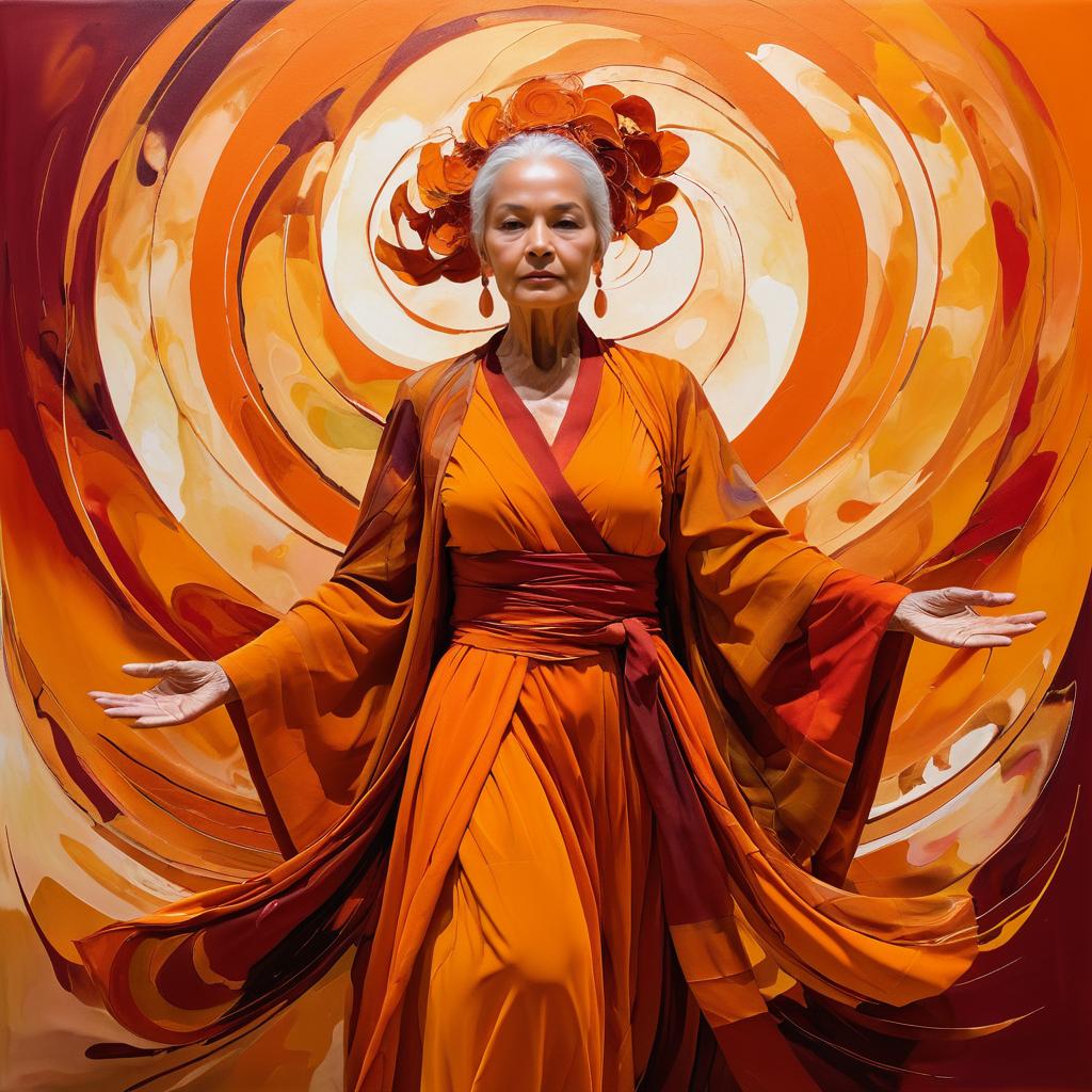 Portrait of an elderly woman with gray hair wearing a flowing orange dress with a deep red sash, set against a dynamic abstract background featuring swirling patterns in shades of orange, red, and white. The energetic and artistic backdrop complements the poised and confident stance of the woman.