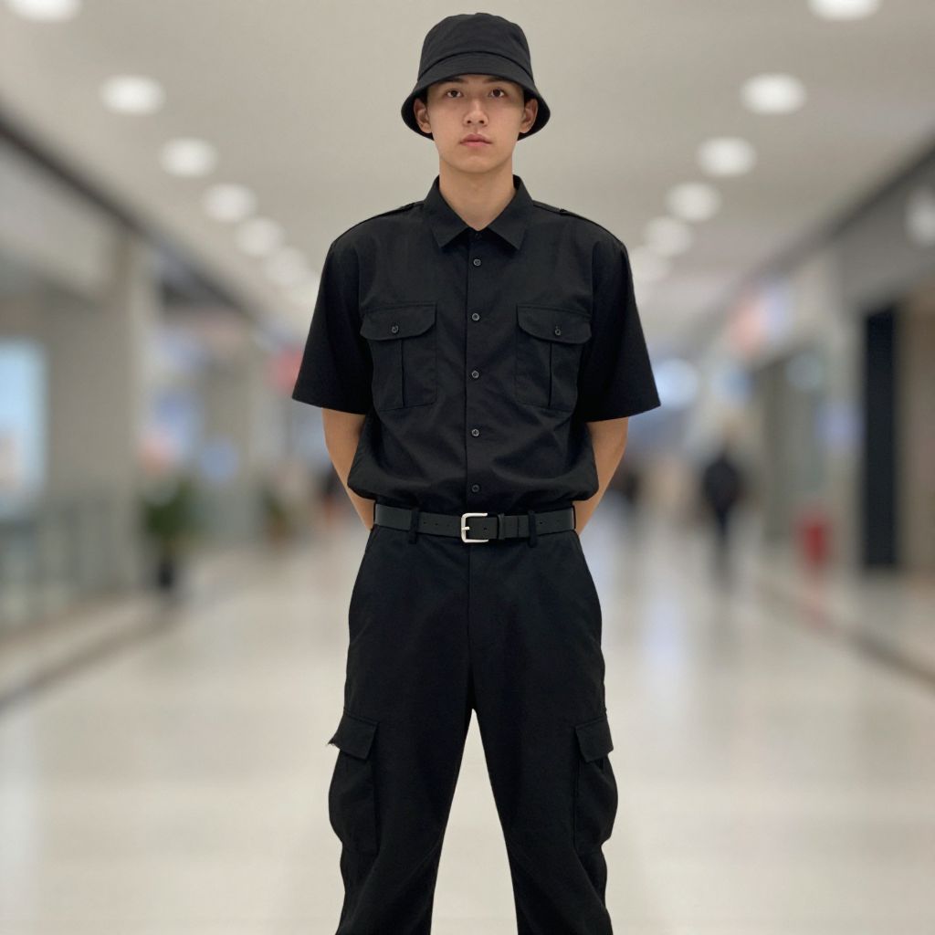 Photograph of a young Asian male standing in a brightly lit, modern hallway with a blurred background. He is wearing a black bucket hat, black short-sleeve button-up shirt with chest pockets, black cargo pants, and a black belt with a silver buckle. His hands are in his pockets, and he has a neutral expression. The floor is shiny and white, reflecting the overhead lights, which are evenly spaced along the ceiling. The overall style is minimalist and contemporary. The background features indistinct figures and objects, adding depth to the image.