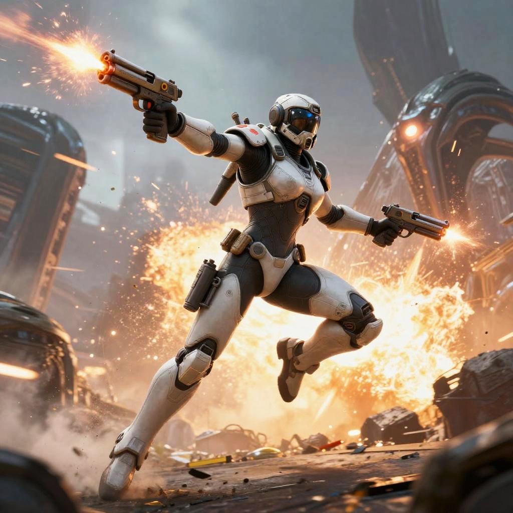 Helldivers 2 female fighter leaping into battle, dual energy pistols drawn, high-tech armored suit, explosive alien warzone backdrop, vibrant colors, dynamic motion blur