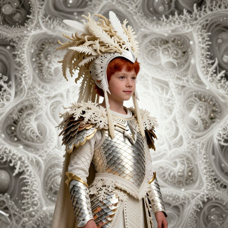 The image depicts a standing boy, approximately nine years old, adorned in a detailed and ornate outfit that evokes a sense of nostalgia for a mythical, possibly Atlantis-inspired world. His headdress is a striking feature, composed of a cream-colored, voluminous seaweed-like material with intricate, white, feather-like accents that cascade down his back. The boy's hair is a vibrant red, adding a pop of color to the otherwise monochromatic palette. His armor is a blend of fish-scale patterns and fine foliage lace, with anodized indentations that give it a metallic sheen. The armor is predominantly white and cream, with hints of gold and copper, creating a striking contrast. The boy's face is serene, with a slight smile that adds a touch of warmth to his expression. The background features a dynamic, fractal mandelbulb pattern in white, cream, and ivory tones, with volumetric lighting that enhances the three-dimensional effect. The overall composition is cinematic, with the boy positioned centrally, and the background elements arranged to create a sense of depth and perspective. The image is a blend of organic and mechanical elements, reminiscent of H.R. Giger's style, with a focus on intricate details and a sense of otherworldly beauty.