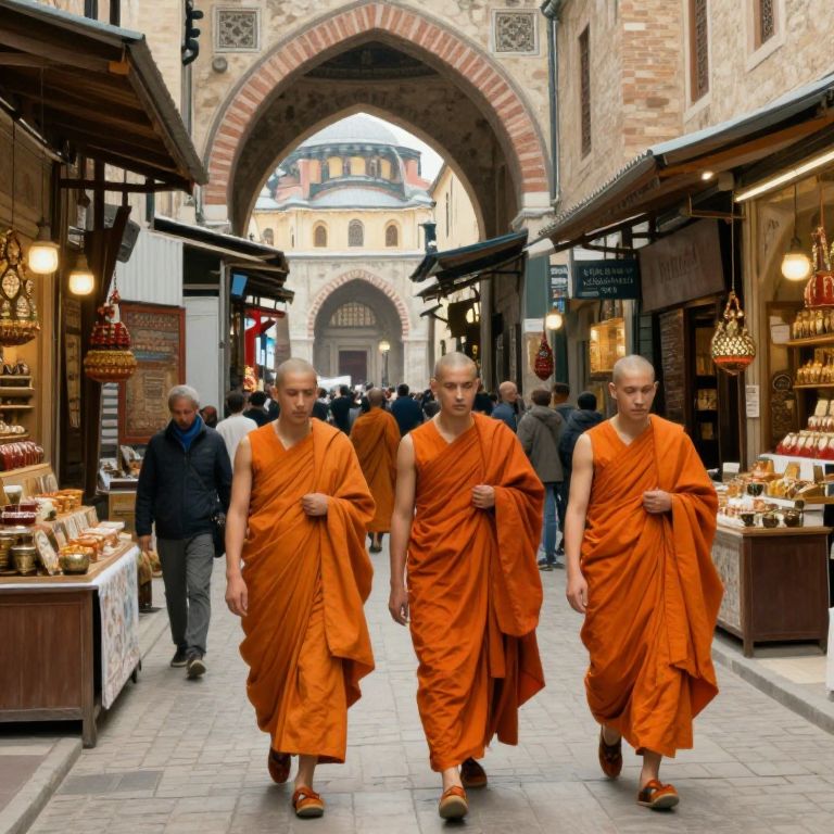 Microgeometry bald budhist monks in orange robes walk through a byzantine, constinople, arab bazaar in style of John Singer Sargent, highly detailed,