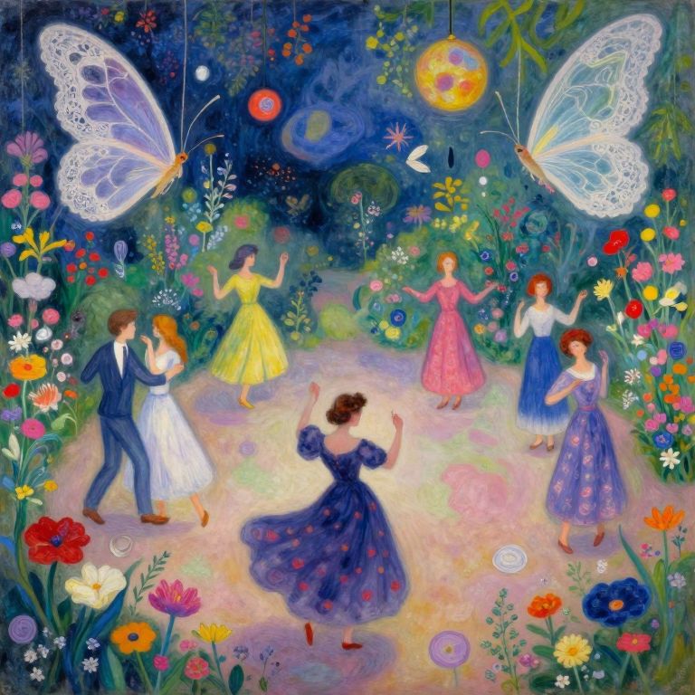 A dreamlike garden party scene unfolds from a bird's-eye view, blending whimsical elements with a touch of impressionism. Guests dance gracefully amidst vibrant flowers and floating objects, defying gravity in an enchanting display reminiscent of Marc Chagall's ethereal paintings. The foreground exudes playful levity, while the background invites introspection, as seen through the delicate lace wings of a butterfly. This panoramic image captures nature's boundless beauty and small wonders, inviting viewers to ponder life's fleeting moments and the serenity found in its simple pleasures.