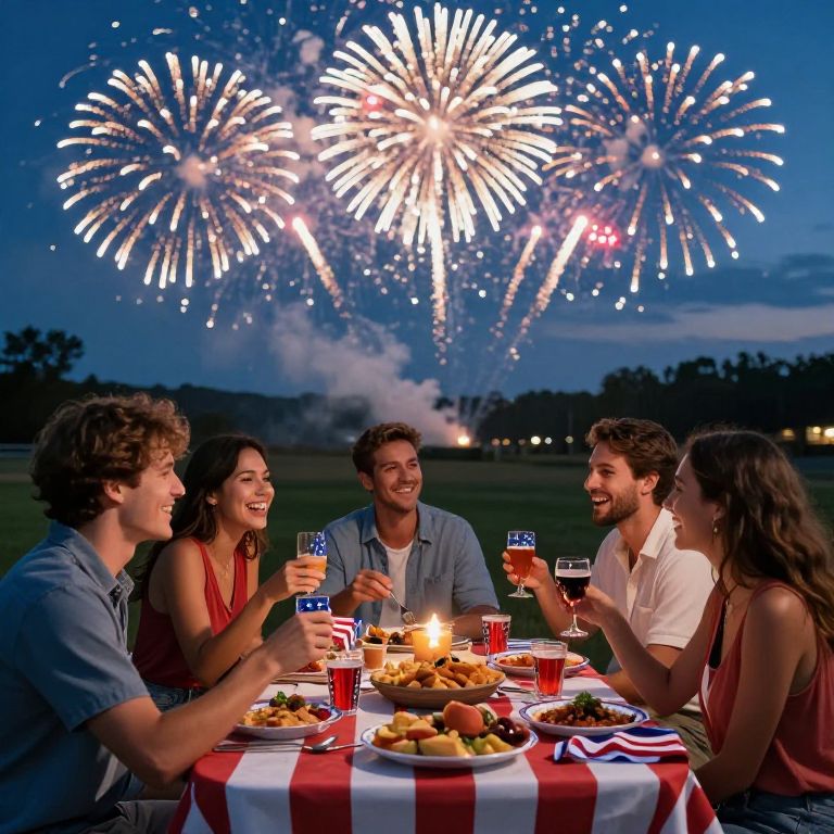 A group of friends gather around a table filled with traditional 4th of July fare, celebrating with joy and laughter under a spectacular display of fireworks in the evening sky.