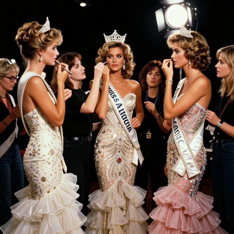 In this vibrant and meticulously detailed photograph, the backstage of a beauty pageant, likely the Miss America competition, is captured in 1983. The image, taken by Lauren Greenfield for Vogue in 1979, showcases three contestants in elaborate evening gowns, each adorned with intricate beadwork and ruffles. One contestant, positioned centrally, wears a striking crown and is surrounded by a team of stylists and assistants. The scene is illuminated by bright lights, casting a warm glow on the subjects and highlighting the shimmering textures of their dresses. The contestants are engaged in final preparations, with one applying makeup and another adjusting her gown. The overall composition is dynamic, with the subjects arranged in a semi-circle, creating a sense of anticipation and excitement. The photograph captures the essence of the pageant, emphasizing the grandeur and meticulous preparation involved in such events.