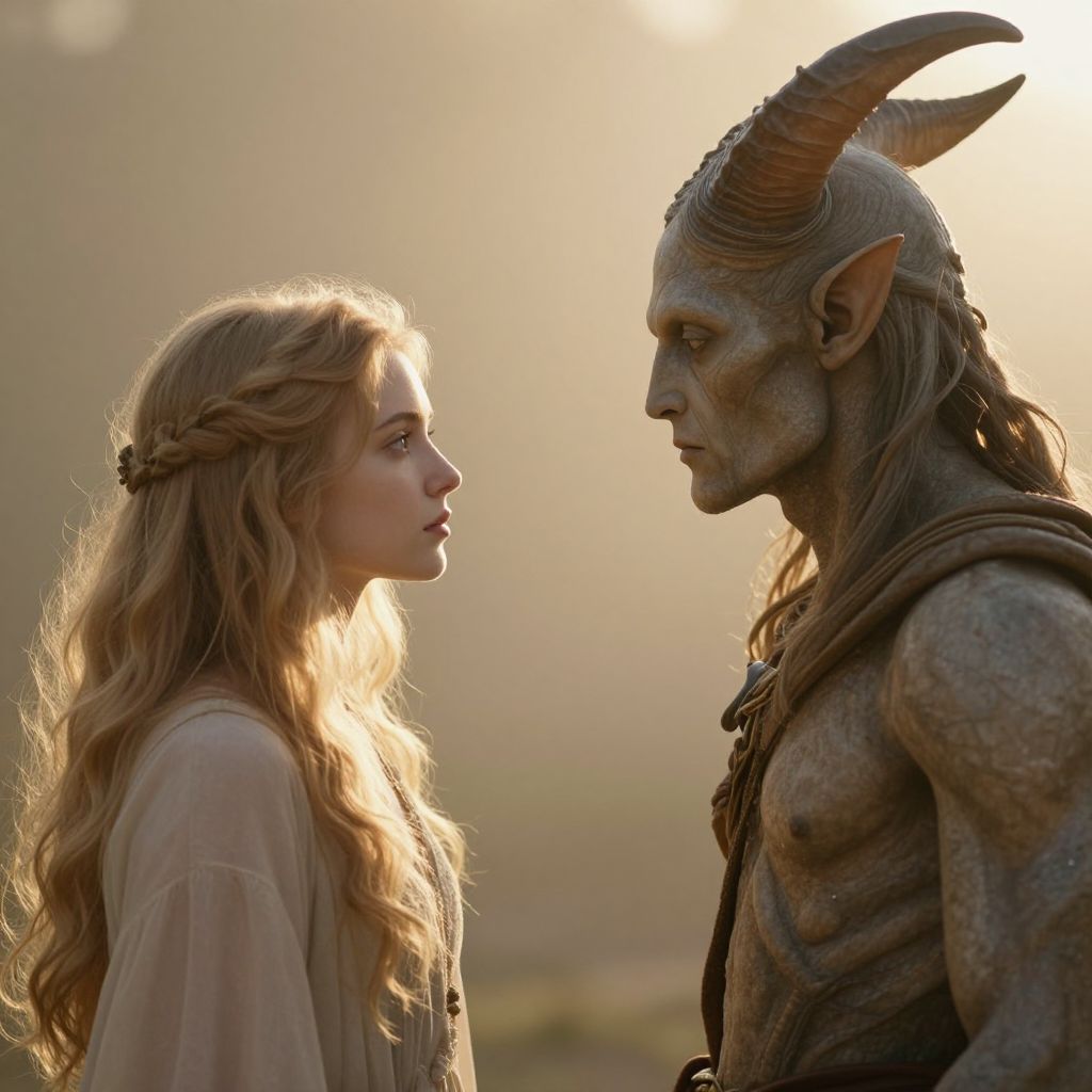 Photograph-like CGI image of a young woman with long, wavy blonde hair and a translucent, light-colored dress facing a tall, muscular, horned demon with gray, scaly skin and pointed ears. The demon has a stern expression and is shirtless, revealing a rugged, textured chest. The background is softly blurred with a warm, golden light, creating a serene yet intense atmosphere. The woman's delicate features contrast with the demon's rough, imposing appearance, highlighting their emotional connection or confrontation. The image evokes a fantasy or mythological theme.