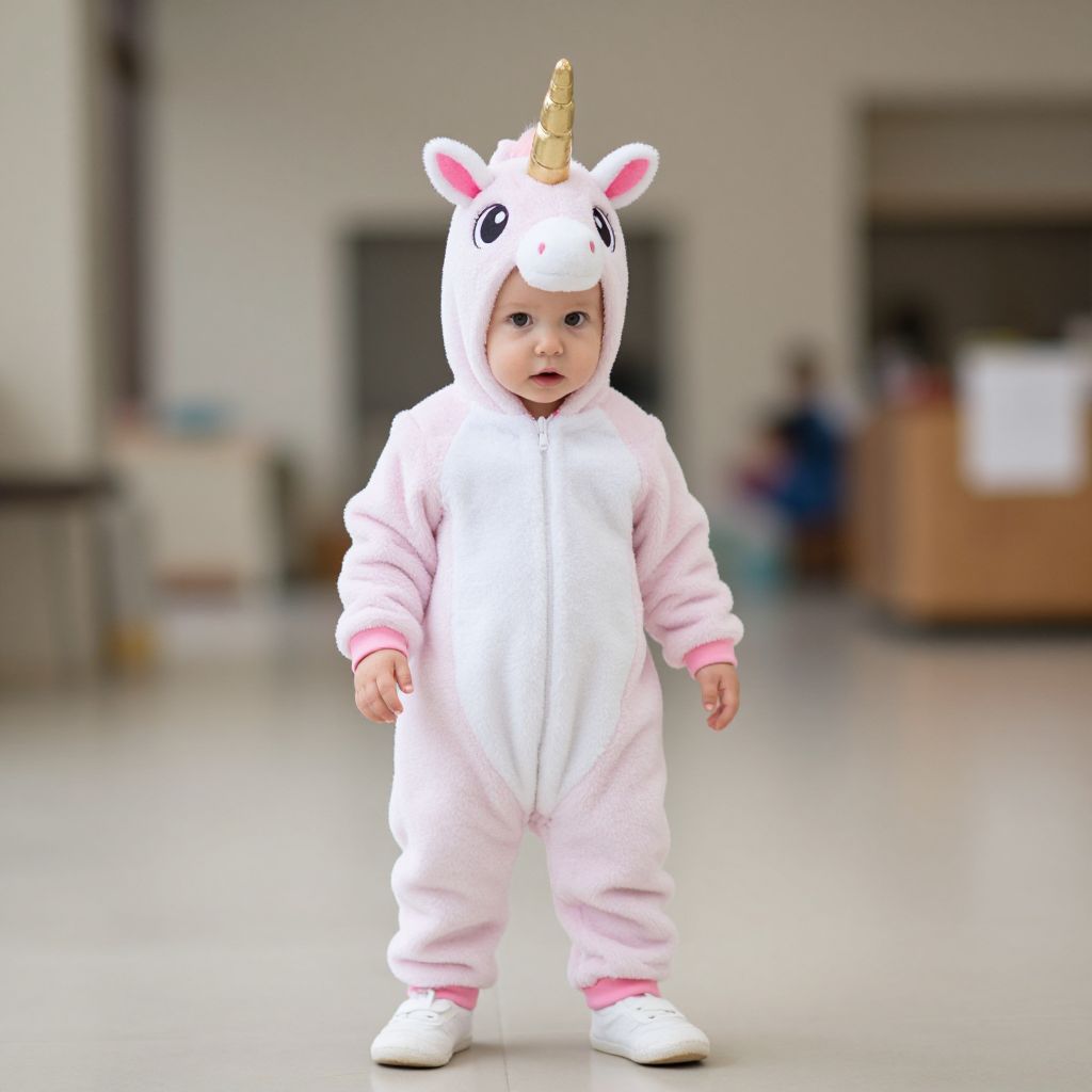 Photograph of a baby in a white unicorn onesie with a gold horn, pink cuffs, and white shoes, standing indoors.