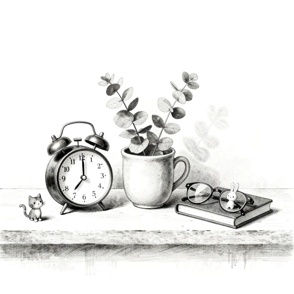 Black-and-white, whimsical hand-drawn still life on a minimalist bedside ledge, centered on ceramic cup holding a sprig of eucalyptus. Arranged around it: sleek metal alarm clock, wire-rimmed glasses, closed journal. Tiny figurines of a cat and a rabbit add charm. Background is minimal, a few lines suggesting a wall and horizon. Soft shading, gentle crosshatching, delicate line art, balanced negative space, subtle paper grain, calm studio light, sketchbook aesthetic.