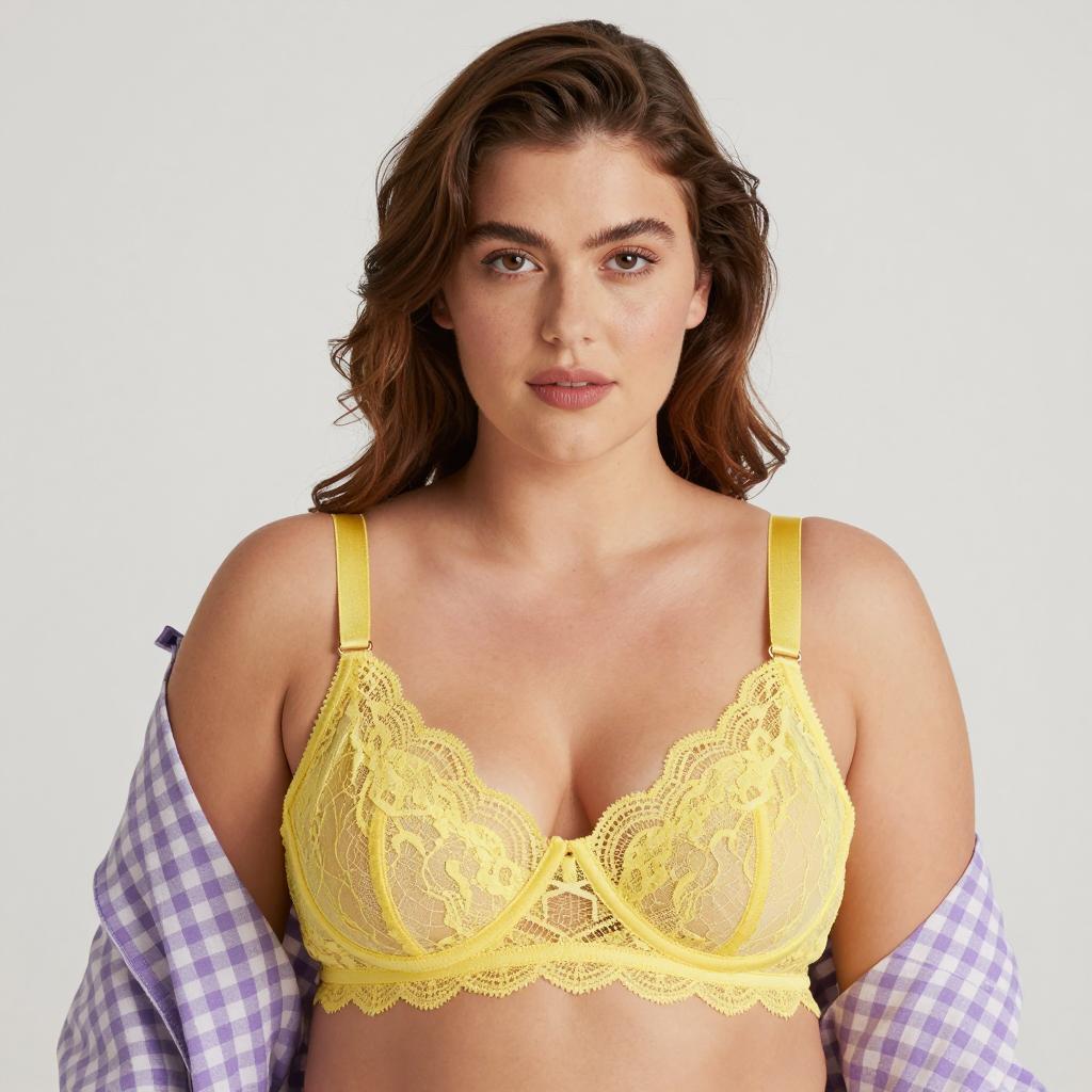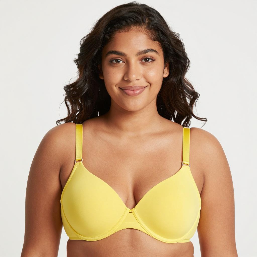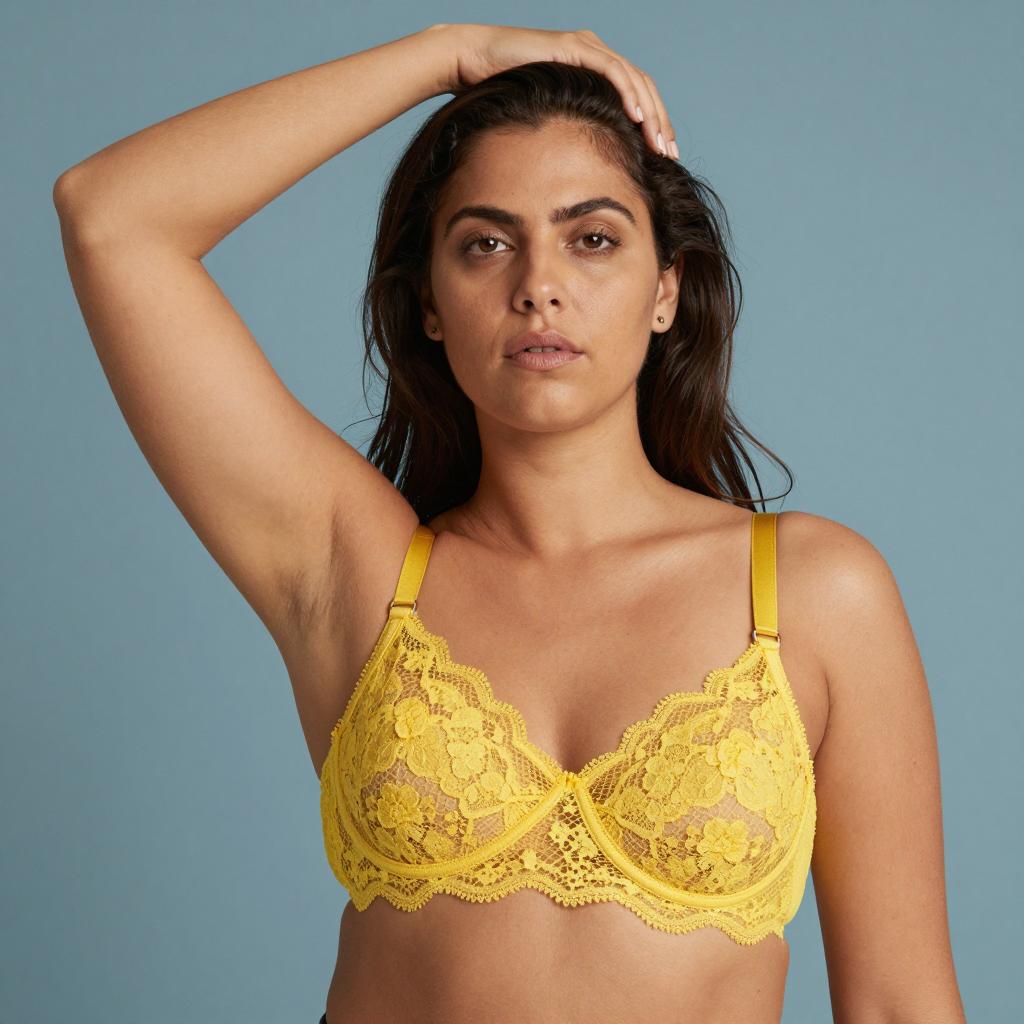 Photograph of a woman with light brown skin, short black wet hair, brown eyes, wearing a yellow lace bra, white round earrings, smiling slightly. She is seated against a light gray background. Her bra has thin straps and a slight pattern. She has a slight belly.