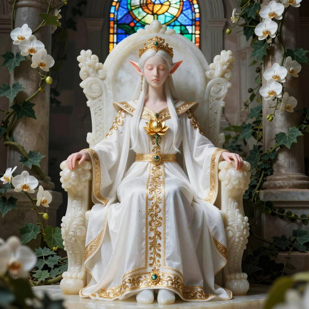 A majestic elf queen seated on a floating seat of shimmering dark onyx, surrounded by a celestial observatory with stars visible through glass dome, her a sleek cloak spun with threads of midnight, adorned with jewels shaped like miniature constellations, soft, diffuse starlight highlighting silhouettes, mystical and regal atmosphere