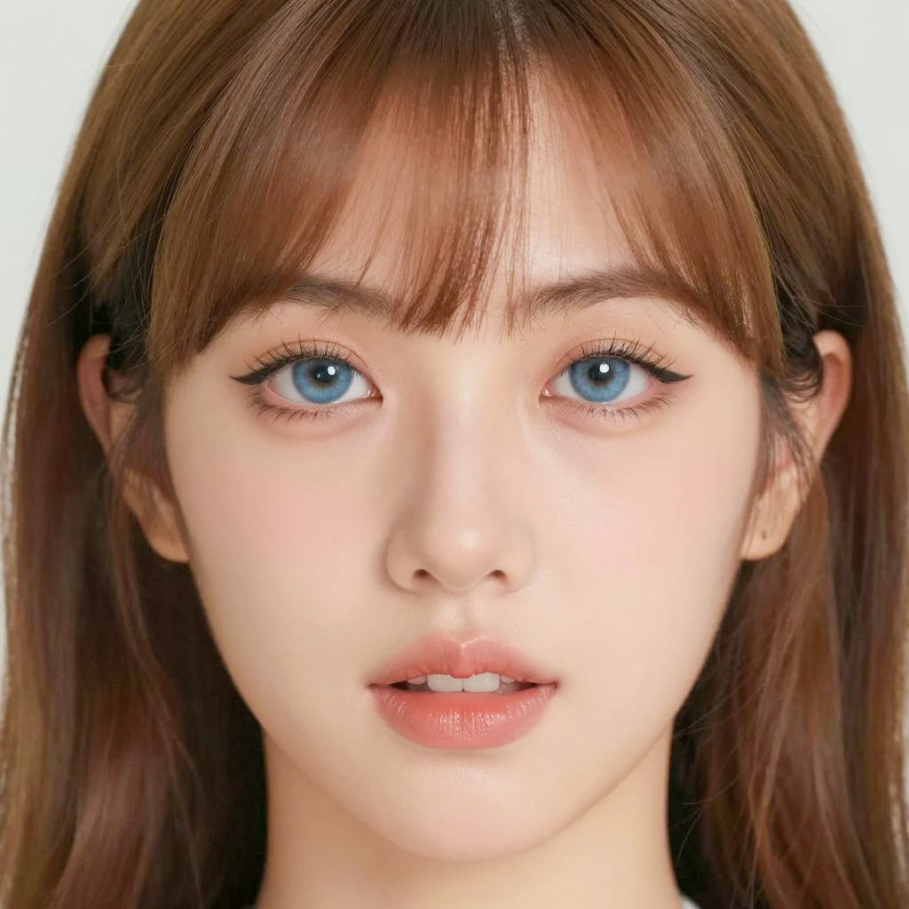 Close-up photograph of a young woman with light blue eyes, fair skin, and full pink lips. She has long, straight brown hair partially covering her face. She wears a red and white checkered top. Her hands are gently holding her hair near her chin. The background is blurred with light blue and brown hues. She has a neutral expression with slightly parted lips.