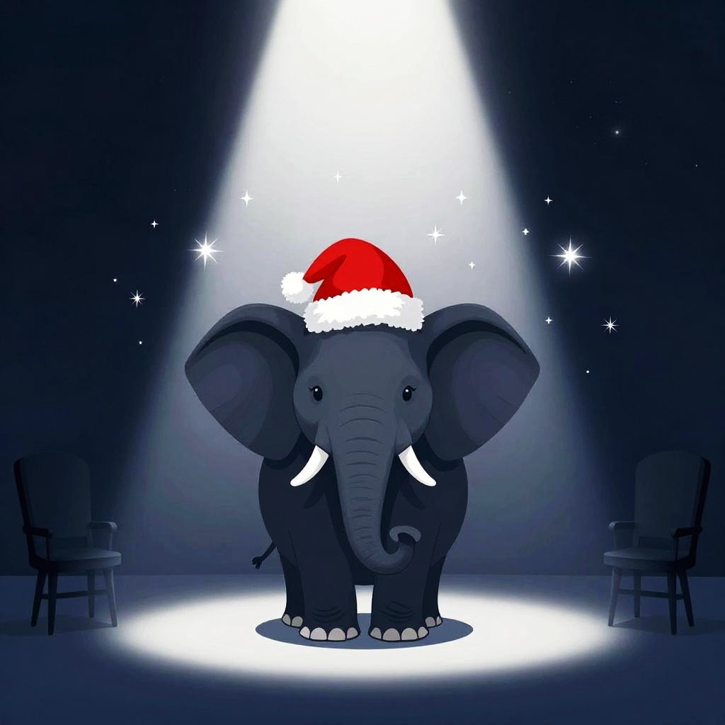 Digital illustration of a silhouetted elephant wearing a red Santa hat, standing center stage under a bright white spotlight. The dark blue background is accentuated with sparkles and star-like specks, creating a magical and festive atmosphere. Two empty chairs flank the elephant, enhancing the theatrical and whimsical mood.