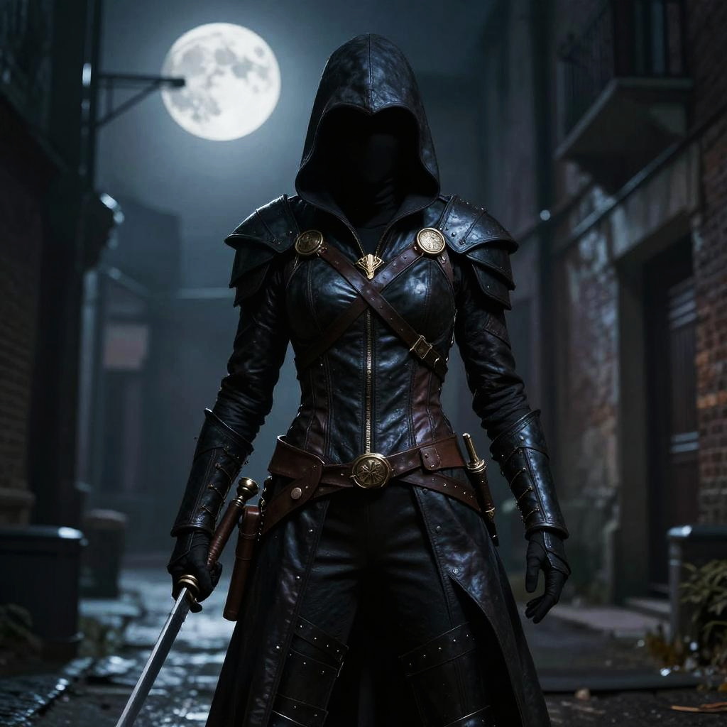 A shadow assassin wearing dark leather armor, surrounded by moonlit alley, art inspired by Elena Gordon.