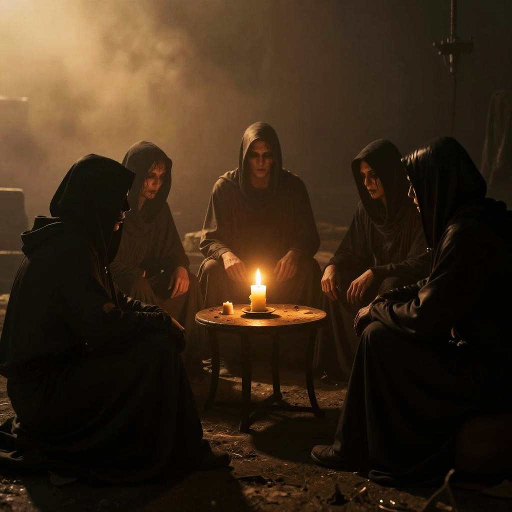 Realistic photo.Five eerie mannequins sitting around a shattered glass table, apocalyptic atmosphere, dark golden hour mood, hyper-realistic, 8K resolution, cinematic lighting, eerie and detailed realistic photo