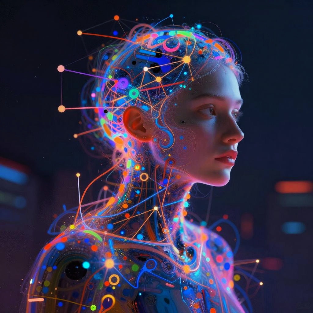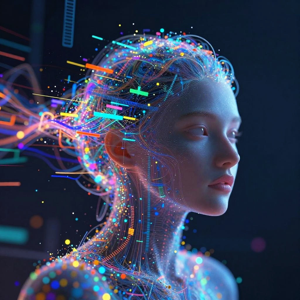 AI generated art online, concept art featuring an AI entity painting on a floating digital canvas in an ethereal virtual space, surrounded by data streams and pixelated energy bursts, soft pastel colors mixed with sharp neon highlights for a surreal artistic atmosphere