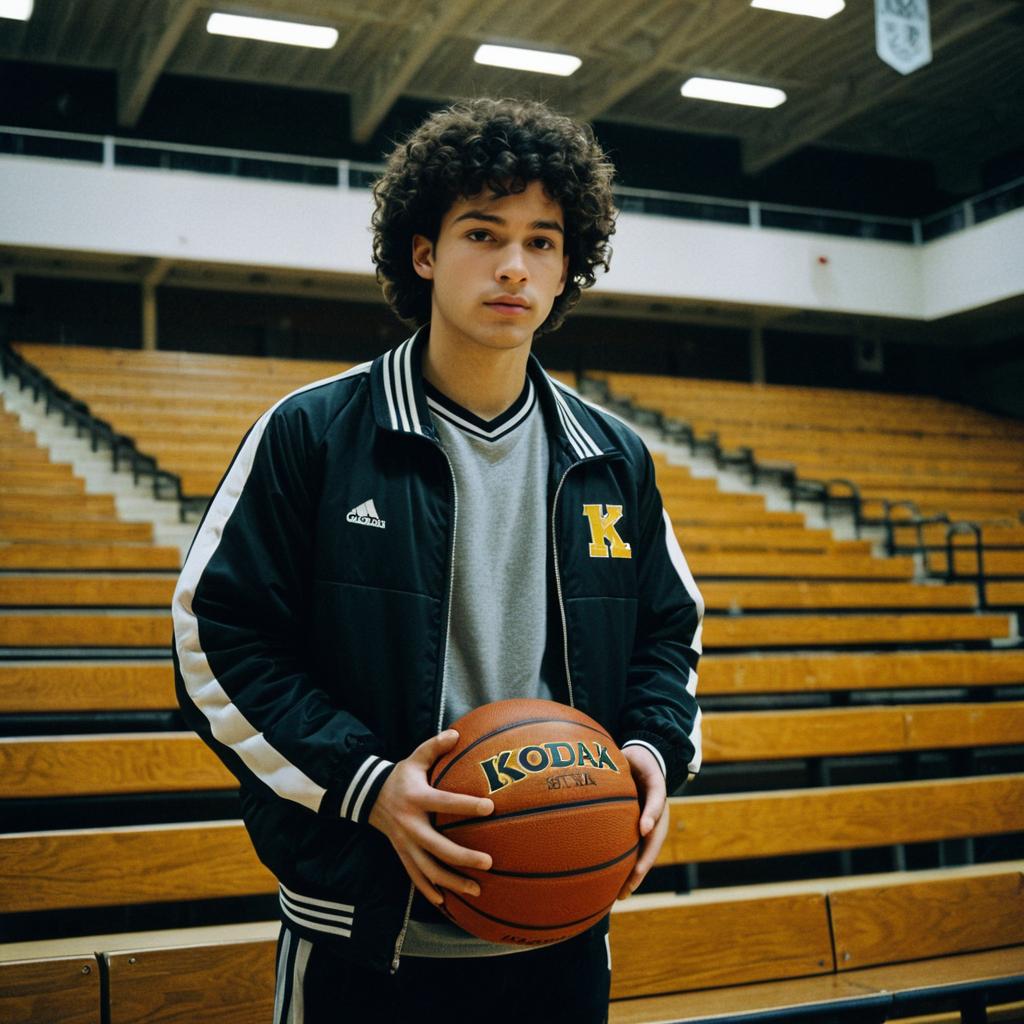 Athletic young man with curly hair wearing a black and white sports jacket with a 'K' emblem, holding a basketball. He is standing in front of empty wooden bleachers inside a gymnasium with a basketball hoop in the background. The setting has a moody, cinematic atmosphere.