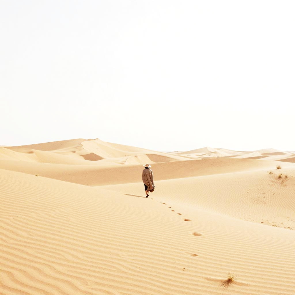 Pilgrim of the endless dunes, loneliness echoes through sand waves, in minimalism with watercolor accents, walking along shifting desert ridges, with wide-brimmed hat and cloak, golden hazy heat shimmer