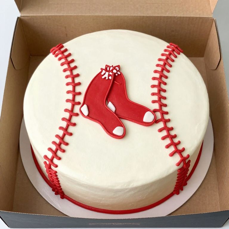 Circular cake designed as a Boston Red Sox baseball, featuring smooth white icing, red stitching details, and a prominent red sock logo at its center, presented inside a cardboard box.