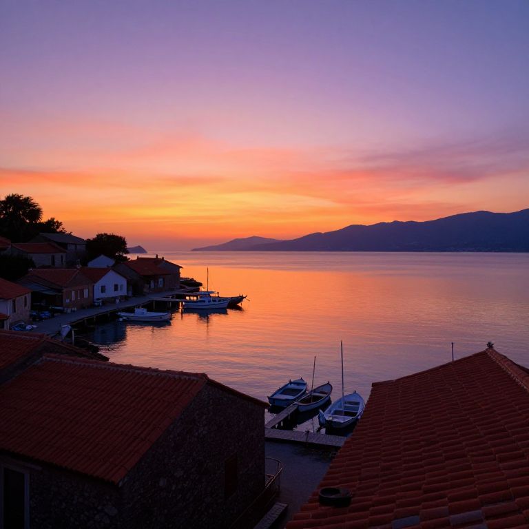 Photograph of a serene coastal sunset with vibrant orange, pink, and purple sky reflecting on calm water, surrounded by red-roofed houses and small