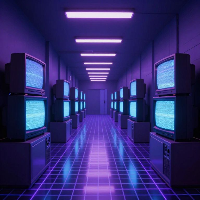 Neon-lit, futuristic room with rows of blue-glowing, vintage CRT TVs, tiled floor, and fluorescent ceiling lights. Retro cyberpunk aesthetic