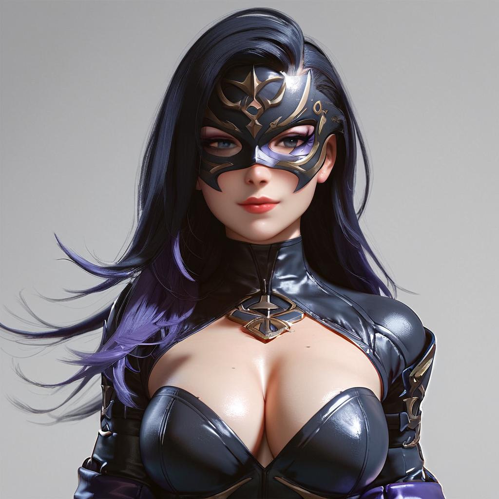 Score_9, score_8_up, score_7_up, score_6_up, score_5_up, score_4_up, , source_cartoon, source_3d, 1girl, violetparr, mask, long hair, black hair, purple eyes, bodysuit, gloves, smile, upper body, looking at viewer